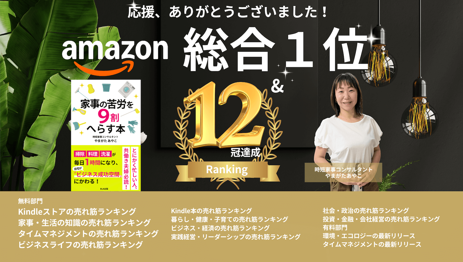 時短家事コンサルタント やまがたあやこの新刊「家事の苦労を9割へらす本」が、Amazon Kindleランキングで、無料部門 総合1位を含む、全12部門で1位を獲得