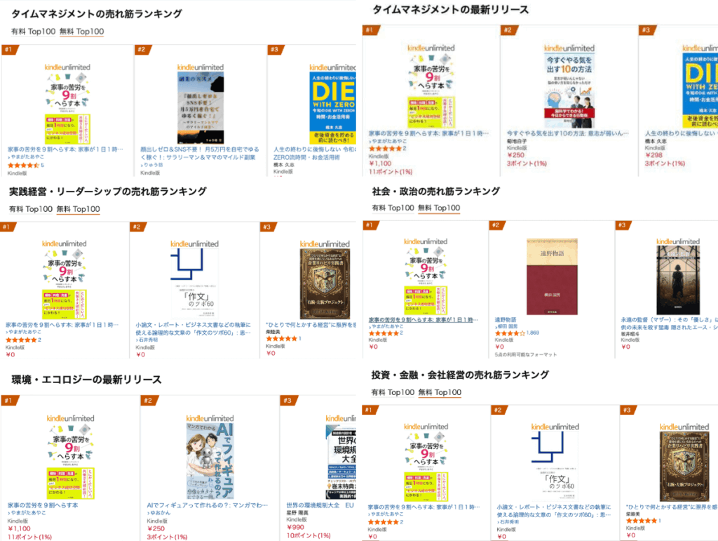 AmazonKindleランキング総合1位ほか、1位獲得部門